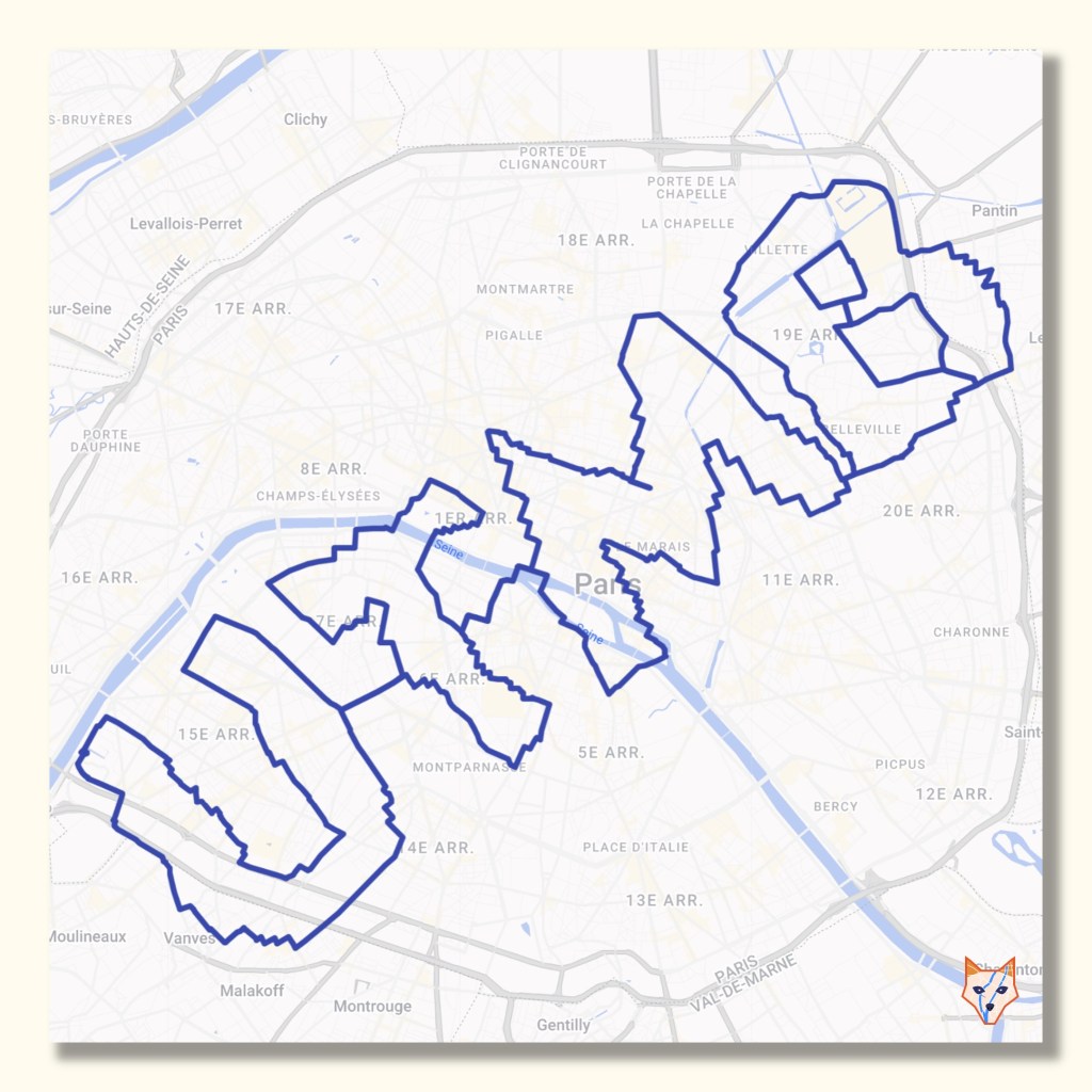 À l’occasion de l’arrivée du Tour de France 2025 à Paris, j’ai imaginé un projet un peu fou : dessiner un vélo géant à l’échelle de la ville de Paris… à vélo évidemment. Un parcours de 120,75 km, avec 857 m de dénivelé positif, réalisé en une seule journée, exclusivement en Vélib’ mécanique !